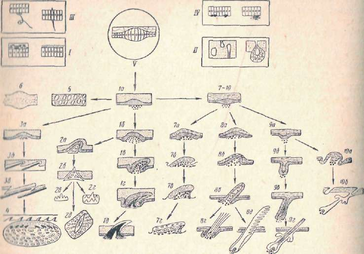 1а-1д — ряд стадий дентинообразовання у акуловых рыб при развитии плакоидных чешуи с типичным эмалевым органом, 2а — 2г — развитие костных зубчиков (2а~2б), спинных жучек и бляшек (2в—2г) в коже осетровых рыб с выпадением дентинообразоаания. За—Зв— развитие циклоидных чешуи в коже костистых рыб при полной рудиментации эмалевого органа, 4 — схема ганоидной чешуи как пример комплекса многих генераций чешуи, 5 и 6 — замещение скелетообразующей функции кожи железистой функцией в коже рыб. 7—10 — общий зачаток роговых чешуи, перьев и волос у амниот. 7а— 7г — стадии развития роговых чешуи у рептилий и птиц, 8а —8г — развитие пухового пера и 8д — развитие контурного пера, 9а—9г — стадии развития полоса при полной рудиментации соединительнотканого сосочка и прогрессивного развития эпидермального зачатка, 10а—10б − восстановление роговых чешуи в коже млекопитающих