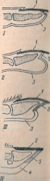 Рис. 8. Продольный разрез через концы пальцев млекопитающих (по Боасу). / — обезьяна, II — человек, III — хищник, IV — лошадь, 1 — когтевая или ногтевая пластинка , 2 — роговая стенка копыта, 3 — подушечка, 4 — стрелка, 5 — подошвенная пластинка