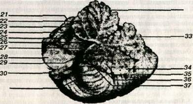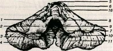 Рис. 13. Мозжечок (вид спереди, снизу). Ножки мозжечка удалены
