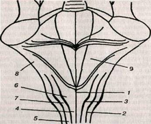 Рис. 23. Схема дорсальной поверхности продолговатого мозга:
