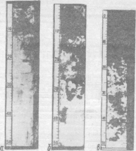 Распад льняной ткани под действием микроорганизмов в черноземе: а, б, в - в течение одного, двух, трех месяцев соответственно
