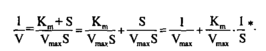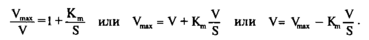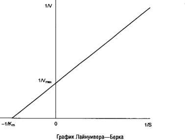 Последнее выражение называют уравнением Лайнуивера–Берка и для расчета кинетических параметров используют график, построенный в координатах: 1/V против 1/S. В результате получается прямая, отсекающая на оси ординат отрезок, равный 1/V, а на продолжении оси абсцисс отрезок, равный – 1/Кга. Однако следует отметить, что при использовании графика Лайнуивера–Берка точки в области высоких концентраций субстрата располагаются слишком густо, а положение прямой линии во многом зависит от точек в области низких концентраций субстрата, где определение скорости менее надежно. Кроме того, реальные экспериментальные данные не всегда адекватно аппроксимируются в виде прямой линии.