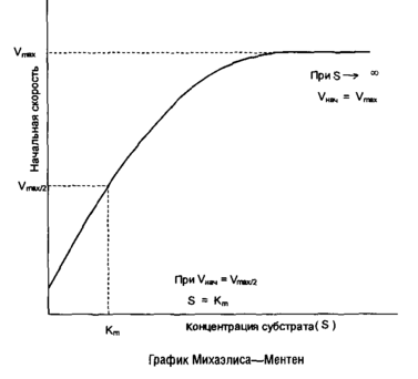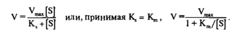 Выражение есть не что иное, как уравнение Михаэлиса–Ментен для ферментативной кинетики, а величина Кга = Ks представляет собой меру сродства фермента к субстрату. Численно она равна такой концентрации субстрата, при которой начальная скорость ферментативной реакции составляет половину максимальной скорости. Уравнение графически выражается гиперболой.