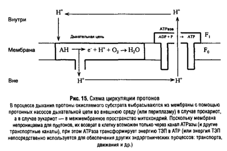 При описании механизма образования АТР путем мембранного фосфорилирования в настоящее время общепринятой является хемиосмотическая теория сопряжения окисления и фосфорилирования, предложенная П. Митчеллом в 1961 г. Согласно этой теории в «сопрягающих» мембранах локализованы два типа систем, способных к транслокации протонов: электрон-транспортная цепь и Н+-АТРаза, координированная работа которых приводит к формированию трансмембранной разности электрохимического потенциала протонов, – а затем АТР. Таким образом, первичной формой запасания энергии при дыхании является ТЭП.