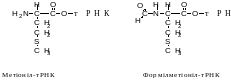 Перша (стартова) аміноацил-тРНК, з якої починається утворення пептидного ланцюга, приєднується до стартового кодону мРНК. Як у прокаріотів, так і у еукаріотів стартовий кодон однаковий – AUG. Таблиця генетичного коду (табл. 1.24) показує, що такий кодон відповідає амінокислоті метіоніну. Але метіоніл-тРНК стартова аміноацил-тРНК лише у еукаріотів. У прокаріотів стартовою аміноацил-тРНК є особлива формілметіоніл-тРНК. Вона утворена нестандартною амінокислотою – формілметіоніном (рис. 1.41).