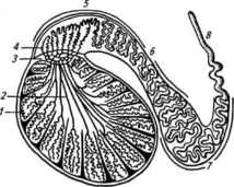 Рис.2. Схема строения семенника с придатком (разрез): 1 - извитые канальцы; 2 - прямые канальцы; 3 - сеть семенника; 4 - семявыносящие канальцы; 5 - головка; 6 - тело; 7 - хвост придатка семенника; 9 – спермиопровод