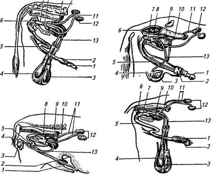 А - быка; Б - жеребца; В - хряка; Г - барана; 1 - головка пениса; 2 - препуций; 3-семенник; 4 - мошонка; 5 - половой член; 5-луковичные железы; 7 - предстательная железа; 8 - пузырьковидные железы; 9-мочевой пузырь; 10 - прямая кишка; 11 - мочеточники; 12 - почки; 13-спермиопровод.