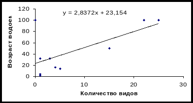 исунок 3. Зависимость числа встреченных видов моллюсков от возраста водоемов
