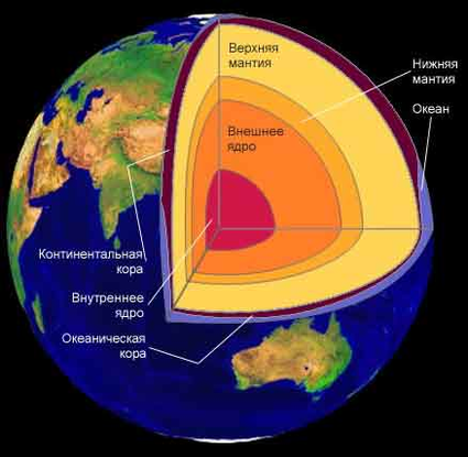 Недра Земли разбивают на три основные области: земную кору, мантию и ядро.
