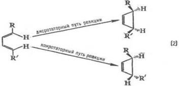 При дисротаторном пути реакции заместители R и R' в продукте будут расположены по одну сторону плоскости цикла, при конротаторном пути – по разные стороны. Эксперимент показывает, что термическая циклизация производных бутадиена происходит по конротаторному пути, а фотохимическая циклизация – по дисротаторному пути.