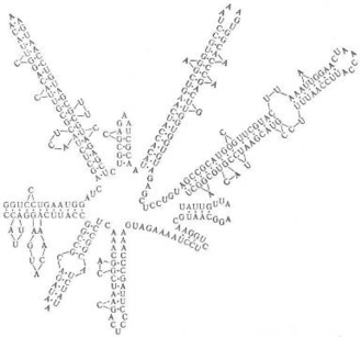 Рибонуклеиновые кислоты. РНК, как правило, построены из одной полинуклеотидной цепи, характерный элемент вторичной структуры которой – «шпильки», перемежающиеся однотяжевыми участками (рис. 2). Шпилька – двутяжевая спиральная структура, образующаяся в результате комплементарного спаривания оснований (А с U и G с С). Шпильки и соединяющие их однотяжевые участки РНК укладываются в компактную третичную структуру. Для РНК вторичная структура имеет характерную форму, которую называют «клеверным листом». Известны редкие примеры целиком двухспиральных молекул РНК.