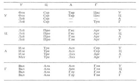 Все синтезируемые в процессе трансляции белки построены из остатков 20 аминокислот (т. наз. кодируемых). Какой именно кодон ответствен за включение той или иной аминокислоты, можно определить по таблице, в которой буквы А, Г, У, Ц обозначают основания, входящие в нуклеотиды (соотв. аденин, гуанин, урацил, цитозин): в вертикальном ряду слева – в первый нуклеотид кодона, в горизонтальном ряду сверху – во второй, в вертикальном ряду справа – в третий. Трехбуквенные сочетания, напр. фен, сер, лей – сокращенные названия аминокислот. Прочерки в таблице означают, что три кодона – УАА, УАГ и УГА в нормальных условиях не кодируют какие-либо аминокислоты. Такие кодоны называются «бессмысленными», или нонсенс-кодонами. Они являются «сигналами» остановки синтеза полипептидной цепи.