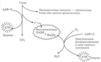 В центре этих превращений в клетке находится АТФ, которая синтезируется из АДФ и Н3Р04 за счет световой энергии или энергии, выделяемой при гликолизе, брожении или дыхании. При гликолизе АТФ выделяется энергия, необходимая для совершения всей работы живого организма — от создания градиентов концентрации ионов и сокращения мышц до синтеза белка. Углеродные остовы для синтеза метаболитов поставляет процесс распада липидов (рис. 1).