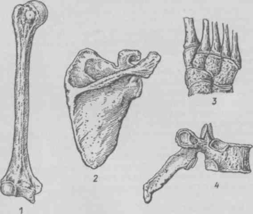 1 - длинная (трубчатая) кость, 2 — плоская кость, 3 - губчатые (короткие) кости, 4 — смешанная кость