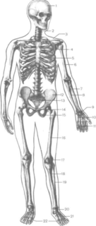 Рис. 1. Скелет человека. Вид спереди: / — череп, 2 — позвоночный столб, 3 — ключица, 4 — ребро, 5 — грудина, 6 — плечевая кость, 7 — лучевая кость, 8 — локтевая кость, 9 — кости запястья, 10 — пястные кости, 11 — фаланги пальцев кисти, 12 — подвздошная кость, 13 — крестец, 14 — лобковая кость, 15 — седалищная кость, 16 — бедренная кость, 17 — надколенник, 18 — большебер-цовая кость, 19 — малоберцовая кость, 20 — кости предплюсны, 21 — плюсневые кости, 22 — фаланги пальцев стопы