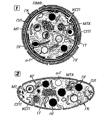 Рис.16. Ультраструктура тромбоцита.1 - сечение в экваториальной плоскости, 2 - поперечный разрез, ПЛ - плазмолемма, ГК - гликокалис, КСП - канальцы, связанные с поверхностью, СПТ - система плотных трубочек, МТ - микротрубочки, ПМФ - подмембранные микрофиламенты, ГГ - гликоген, КГ - комплекс Гольджи, МТХ - митохондрия, α-Г - α-гранулы, ПГ - плотные гранулы.