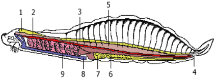 Рис. 3 Половая система на вскрытом ланцетнике: 1 - расширение нервной трубки, 2 - спинная аорта, 3 - нервная трубка, 4 - анус, 5 - нотохорд, 6 - кишечник, 7 - гонады, 8 - венозный синус, 9 - жаберные щели.