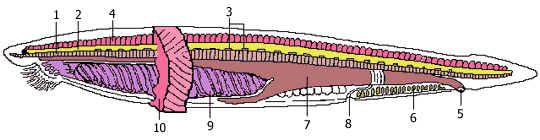 Рис. 2. Продольный разрез ланцетника: 1 - хорда, 2 - нервная трубка, 3 - глазки Гесся, 4 - миомеры, 5 - анус, 6 - гонады, 7 - кишечник, 8 - атриапор, 9 - глотка, 10 - мышечный слой.