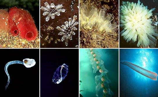 Оболочники. Верхний ряд – асцидии, слева направо: асцидия ментула, колония ботриллуса Шлоссера, клавелина, желудочная циона. Нижний ряд, слева направо: аппендикулярия ойкоплевра, бочёночник долиолетта, колония сальп пегия, атлантическая пиросома