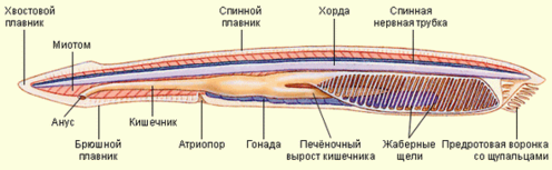 Скелет. Основу опорной системы составляет хорда, представляющая систему поперечных мышечных пластинок, окруженных соединительнотканной оболочкой. Хорда на переднем конце простирается дальше нервной трубки. К хорде примыкает 50-80 мышечных сегментов (миомер), разделенных перегородками (миосептами). Миомеры состоят из поперечнополосатых мышц. Перегородки связаны с оболочкой хорды и кориумом. Сокращение миомер обеспечивает движение животного.