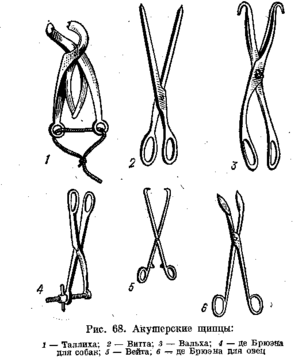 Акушерские щипцы (рис. 68) применяют для извлечения плодов. У крупных животных наиболее удобно пользоваться щипцами Талднда. Они состоят из двух крестообразно изогнутых браншей.