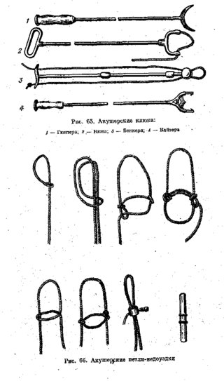 Клюка Кюна на концах полукруглой вилки имеет по одному. отверстию, через которые продевают веревку. При натяжении конца веревки клюка плотно прижимается к необходимой части плода, в результате чего при отталкивании его соскользнуть не может. Клюка применяется как для отталкивания, так в для извлечения плода.