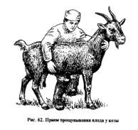 При массовых исследованиях прибегают к следующему приему. Присев слева возле животного, свою правую ногу, согнутую в колене, подводят под живот козы (овцы), плавно приподнимая вентральную брюшную стенку вверх и вправо. Одновременно правой рукой пальпируют матку (рис. 62).
