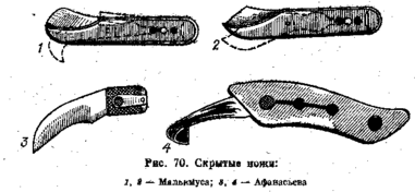 Скрытые ножи (рис. 70) бывают двух моделей: у ножей модели Афанасьева лезвие выдвигается из ручки вперед, у ножец модели Малькмуса оно выступает через щель между боковыми пластинками ручки. Нож в закрытом виде вводят в полость матки с акушерской веревкой, продетой через отверстие в рукоятке. Надавливая пальцем правой руки на тупую поверхность вожа, а левой потягивая за веревку, производят рассечение необходимых мягких частей плода.