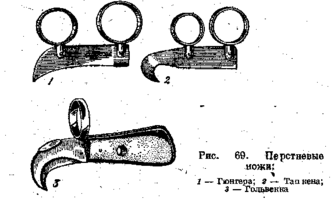 Перстневые ножи (рис. 69) моделей Гюнтера, Тапкена, Гольвекка применяются для рассечения мягких Тканей плода. Кольцо или кольца ножа надевают на средний палец, а остальными, пальцами прикрывают лезвие при его введении в родовые пути и выведении наружу.