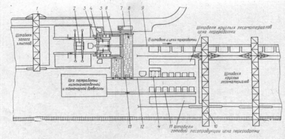 Низкокачественное долготье сбрасывается с транспортера 6 на площадку 4. На этой площадке долготье раскряжевывают на круглопильном станке (ЦБ-4, ЦБ-5, АЦ-1 или АЦ-2М) на чураки, которые раскалывают на поленья на колуне. Круглые и колотые поленья транспортером 5 подаются в цех 19 для производства технологической щепы, а часть укладывается в штабеля 11 для отгрузки потребителю или на резервную площадку 14 для цеха 19. Из цеха 19 щепа поступает в контейнеры 16, которые по рельсовому пути 17 при помощи лебедки 18 подаются в зону действия крана 7 для укладки их на площадке или на погрузку в вагоны МПС.