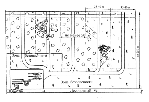 Почвенно-грунтовые условия должны обеспечивать проходимость трелевочного трактора по волоку, укрепленному порубочными остатками. Размеры погрузочного пункта 30х40 м. Ширина пасек 25…30 м.