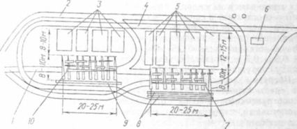 На рисунке приведена технологическая схема прирельсового нижнего склада с годовым грузооборотом 30—50 тыс. м3.