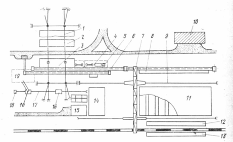 Лесовозные автопоезда разгружаются кабельным краном 1 (КК-20). Хлысты подаются на разгрузочно-раскряжевочную эстакаду 3 или в запас на площадку 2. Разделение пачки хлыстов на эстакаде осуществляется растаскивателем РХ-2А, зачистка сучьев выполняется электросучкорезкой РЭС-2, раскряжевка хлыстов — электропилами ЭПЧ-3. Круглые лесоматериалы сортируются по лесонакопителям 8 сортировочным транспортером 6 (Б-22У). Из лесонакопителей лесоматериалы консольно-козловым краном 7 (ККС-10), установленным на подкрановых путях 9, укладываются в штабеля 11 или грузятся в вагоны, если те стоят под погрузкой.