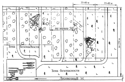 В первую очередь разрабатывается 50-метровая зона безопасности. Лесосека (делянка) разбивается на пасеки шириной 35…40 м. Пасечные волоки шириной 4…5 м прокладываются посередине. Валка деревьев начинается с дальнего конца. Расстояние между одновременно разрабатываемыми пасеками должно быть не менее 50 м.
