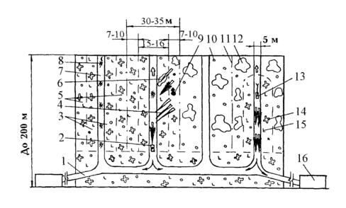 1 - магистральный трелевочный волок; 2 - трелевочный трактор; 3 - ленты, разработанные валочно-пакетирующей машиной; 4 - хлысты; 5 - ленты, разработанные по традиционной технологии; 6 - деревья; 7 - порубочные остатки; 8 - пасечный волок; 9 - вальщик; 10 - подрост; 11 - граница пасеки; 12 - растущий лес; 13 - валочно-пакетирующая машина; 14 - деревья, вырубаемые во второй и последующие приемы; 15 - пни; 16 - погрузочный пункт; - направление валки; - направление трелевки
