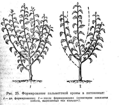 У саженцев на сеянцевых подвоях и дусенах к основным побегам добавляют еще один (запасной), который размещается ниже или между ними. У саженцев, привитых на парадизке и айве, предназначенных для закладки шпалерных садов, оставляют, но два запасных победа, находящихся ниже основных разветвлений. Все остальные ветви в кроне, в том числе и конкуренты проводников, вырезают «на кольцо».