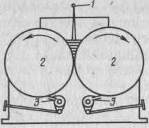 Сушка в вальцовых сушилках. Вальцовые сушилки применяют для производства хлопьев из картофельного пюре. Это новый продукт переработки, требующий минимальной кулинарной обработки. Двухвальцовая сушилка, схема которой представлена на рисунке 2, состоит из двух вальцов-барабанов большого диаметра, обогреваемых изнутри паром. Барабаны вращаются в противоположные стороны. На них подается картофельное пюре, которое тонкой пленкой распределяется на их горячей поверхности. Температура и скорость вращения барабанов отрегулированы так, что за один оборот пленка пюре полностью высыхает до влажности 4—6 % и снимается уже в виде хлопьев с нижней стороны при помощи ножей. При такой технологии продукт может получиться с большим содержанием клейстеризованного крахмала, хлопья будут хрупкими и легко разрушаться, образуя много пылевидных частиц.