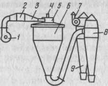 Процесс сушки в распылительных сушилках. В вальцовых сушилках можно сушить овощные и плодовые пюре, но чаще для этого применяют распылительные сушилки. В них тонкодиспергированный продукт в виде аэрозоля попадает в поток горячего воздуха, нагретого до 120—180 °С, и почти мгновенно высушивается. Кратковременность сушки обуславливает получение сушеных порошков высокого качества, из которых после восстановления образуются соки или пюре, близкие по свойствам к исходному сырью. Схема устройства распылительной сушилки представлена на рисунке 3. Воздух, нагретый в калорифере до температуры 120— 180 °С, подают вентилятором с большой скоростью в сушильную камеру, в которую поступает также распыленный при помощи форсунок или других устройств продукт. Малые капли его, охваченные горячим воздухом, быстро высыхают и увлекаются током воздуха в разделительную камеру. Здесь за счет центробежной силы, создаваемой в циклоне, высушенный порошок отделяется и собирается в сборниках, а насыщенный влагой воздух выбрасывается наружу.