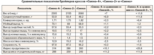 Направленная крупномасштабная селекция исходных линий по комплексу признаков с прилитием крови лучших зарубежных кроссов значительно повысила племенные достоинства отечественной птицы и позволила создать кросс “Смена-4”, превосходящий кроссы “Смена” и “Смена-2” по скорости роста, мясным качествам и конверсии корма.