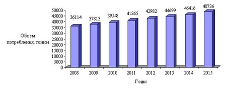 Построение прогноза развития рынка СЗР позволяет сделать вывод о том, что объем потребления данных средств, увеличится к 2015 гг. на 48,8% по сравнению с 2006 г. Средний годовой темп роста рынка составит 5% в год.