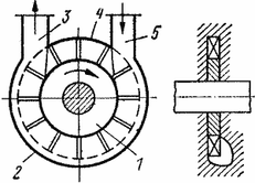Рис. 3. Схема вихревого насоса. 1 - рабочее колесо; 2 - лопатка; 3 - корпус; 4 - всасывающее отверстие; 5 — выходное отверстие.