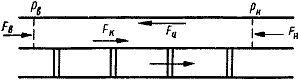 Для определения гидравлической мощности вихревого рабочего процесса NB рассмотрим равновесие жидкости в канале. На (см. рис. 6) изображена развертка сечения канала цилиндром, соосным насосу. На жидкость, находящуюся в канале, действуют силы давления в сечении входа в канал FB и в сечении выхода из канала FH, окружная составляющая сил трения жидкости о стенку канала FU и сила FK, с которой рабочее колесо действует на жидкость в канале. Учитывая, что моменты скоростей жидкости во входном и выходном сечениях канала практически одинаковы, получим момент сил, с которыми рабочее колесо действует на жидкость в канале: