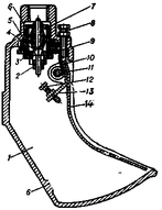Для поения животных применяются как стационарные, так и передвижные групповые и индивидуальные автопоилки. Они различны по устройству, но в зимнее время без подогрева не работают, их конструкция и размеры зависят от вида животных. Индивидуальная автопоилка для крупного рогатого скота (рис. 10) состоит из корпуса, поильной чаши 4, клапана 2, нажимной педали 3. При нажатии на педаль движение передается на клапан, и он открывает отверстие, через которое вода течет в поильную чашу. Такие поилки ставить каждому животному вряд _ ли целесообразно. Представляется, что учащимся стоит подумать о создании более простой и технически надежной, отвечающей зоотехническим требованиям системы для поения скота в любое время суток и года. Клапан 2 может закрываться резиновым амортизатором 5 или металлической пружиной.