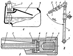 Рис. 13. а - чашечная: 1 - водопроводная труба; 2 - корпус клапана; 3 - крышка; 4 - чаша; б - сосковая в разрезе: 1 - сосок; 2 - корпус; 3, 4 - уплотнения; 5 - амортизатор: 6 - клапан; 7 - резьба; в - установка сосковой автопоилки на водопроводе: 1 - сосок; 2 - корпус; 3 - муфта; 4 - контргайка; 5 - вентиль; 6, 7 - вертикальная и горизонтальная труба водопровода.