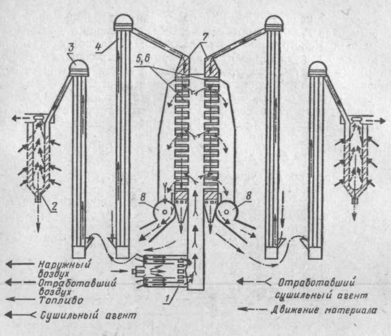 1—топка; 2 — охладительная колонка; 3, 4 — нории; 5, 6 — шахты; 7 — надсушильные бункера; 8 — вентиляторы.