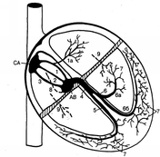 Топографические и функционально иннервация правыми и левыми блуждающими и симпатическими нервами отличается, различия сведены в таблицу 4. Эффекты от раздражения симпатических нервов и вагуса в остром опыте сведены в таблицу 5. Детально механизмы этих эффектов представлены в таблице 6.