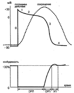 Рис. 2. Электрохимический потенциал, физическое сокращение и уровень возбудимости «быстрых» кардиомиоцитов