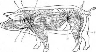 Рис. 3. Поверхностные лимфатические узлы свиньи (из Koch, 1965):