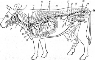 Рис. 2. Глубокие лимфатические узлы крупного рогатого скота (из Koch, 1965):