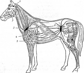 Рис. 4. Поверхностные лимфатические узлы лошади (из Koch, 1965):